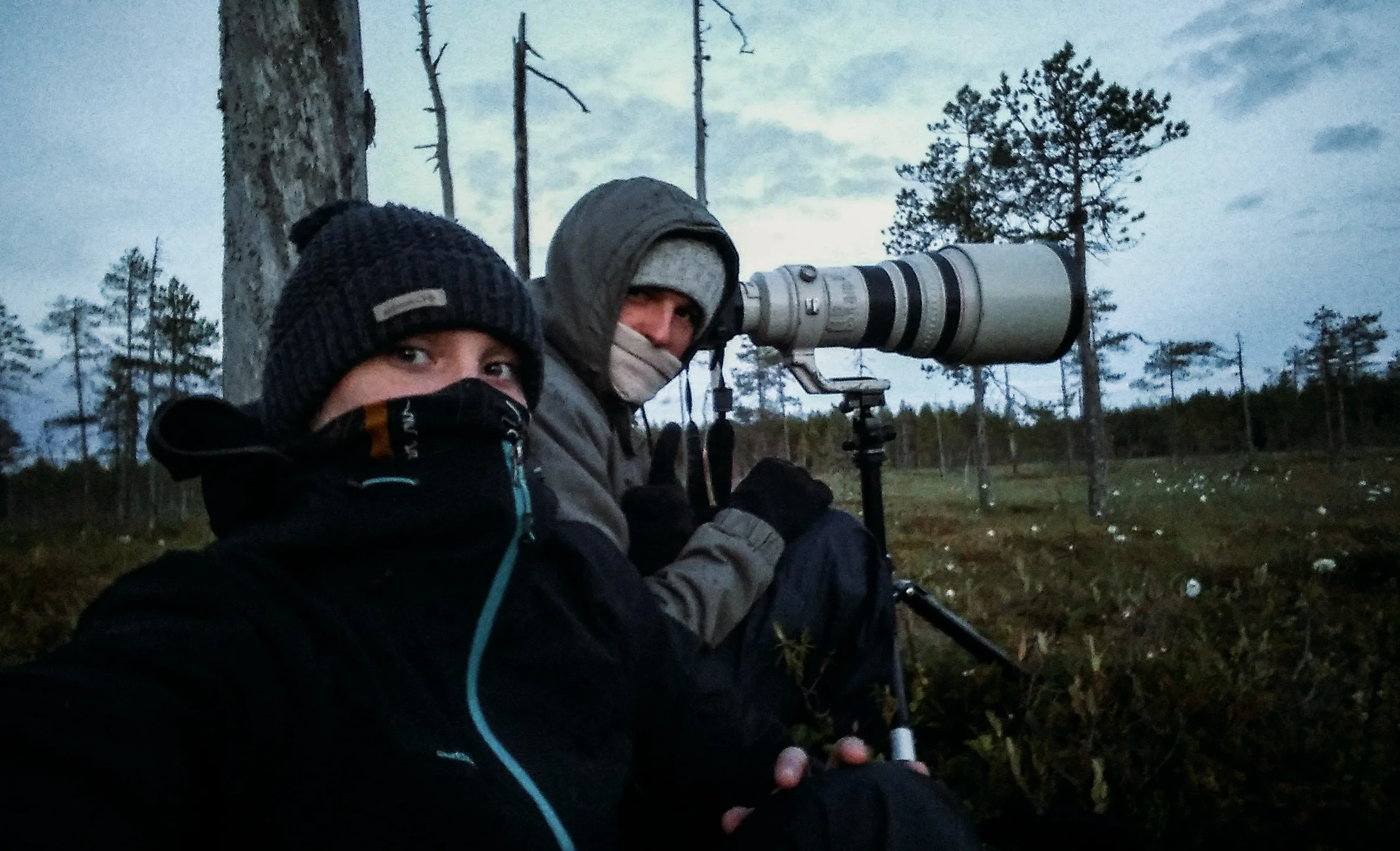 Départ le lendemain matin direction Kuhmo avec pour objectif de voir des ours et des loups. Il faut savoir qu'ici en Finlande, il est très difficile de les voir sans affût appâté, je connais un photographe qui a fait un livre sur la taïga et pendant 20 ans, il n'a vu que quelques ours dans la nature, et un ou deux loups. On va donc mettre toutes les chances de notre côté. En même temps nous allons passer une semaine sur le terrain en essayant de les voir par nos propres moyens, mais en même temps nous irons passer deux nuits dans des affûts appâtés pour augmenter nos chances d'en voir. C'est donc après notre départ de Kajaani en passant par Kuhmo que nous arrivons dans notre premier affût appâté. Le patron du centre était vraiment sympa, c'est lui qui était venu nous chercher en voiture à Kuhmo et il a toujours plein de choses à raconter. Le centre possède environ 14-15 affûts appâtés au total, certains sont spécialisés pour les ours, d'autres pour les loups, d'autres pour les chouettes, certains sont aussi appropriés pour une saison en particulier, d'autres pour une autre, etc. Il nous expliquait que chaque jour, ils mettaient environ 50 kilos de viande par affût. Au final, cela marche bien, car depuis ces 6 dernières années, il n'y a pas eu d'ours seulement une fois. Le programme à notre arrivée est le suivant, à 16h on a le dîner, à 17h on part à l'affût et à 7h le lendemain matin on vient nous rechercher. En vrai, la nuit a été juste parfaite. On a d'abord vu un renne sauvage sur la route. Peu de temps après être rentré dans l'affût, on a vu un couple de Pygargues à queue blanche, ils nous ont tourné autour plusieurs fois. Un glouton est passé un peu au loin, mais j'ai quand même une image où il a la tête levée. Ensuite, nous avons vu 3 familles d'ours avec à chaque fois la mère et ses 2 petits, pour une durée totale de 3h et à juste quelques mètres de nous. Et enfin en dernier, vers 5h du matin, un gros mâle est venu à quelques mètres pareil. Après une petite heure de sommeil, mais plein d'images en tête et autant dans les cartes mémoires, nous reprenons les chemins de randonnée pour 3 nuits dans une réserve naturelle au sud de l'affût, afin de rejoindre un second centre d'affûts appâtés au sud de la réserve. Pour ce qui est de trouver des cabanes avec une vue sur un magnifique lac, la chance a été de notre côté. La lumière de ces couchers de soleil est vraiment très belle, presque éternelle, de quoi parfaire nos soirées "chamallow" au coin du feu. Après plusieurs jours "into the wild", nous n'avions qu'une hâte, c'est de recharger nos batteries. Nous arrivons suffisamment tôt au second centre d'affûts appâtés pour se faire offrir un sauna avec trois aller-retour dans un lac, plus une bonne douche, ça faisait bien longtemps. Après les ventres rassasiés comme jamais, nous partons à l'affût pour une autre "nuit". On a eu moins d'animation que dans le précédent affût, plus loin et moins longtemps, mais on n'est quand même pas revenu bredouille. On a vu en tout un couple de Pygargues à queue blanche, 12 passages d'ours, certains étant sûrement repassés, et enfin un loup solitaire, à 7h du matin en plus, sans doute une femelle dû à son pelage blond, elle a enterré plusieurs bouts de la carcasse avant de rejoindre deux de ses congénères au fond du marais (que nous n'avons pas vus). Jusqu'à la dernière minute, notre planning pour la suite a changé, assez stressant pour moi qui aime bien prévoir à l'avance. Nous partons donc finalement le lendemain matin tôt pour Vaala, on a enfin une piste pour la chouette lapone. Vous allez me dire, pourquoi j'en veux autant après cette chouette, déjà parce que c'est chouette et aussi parce qu'elle est rare, c'est le top pour un photographe animalier de pouvoir la photographier, et trouver un nid avec des petits c'est un peu comme le graal.