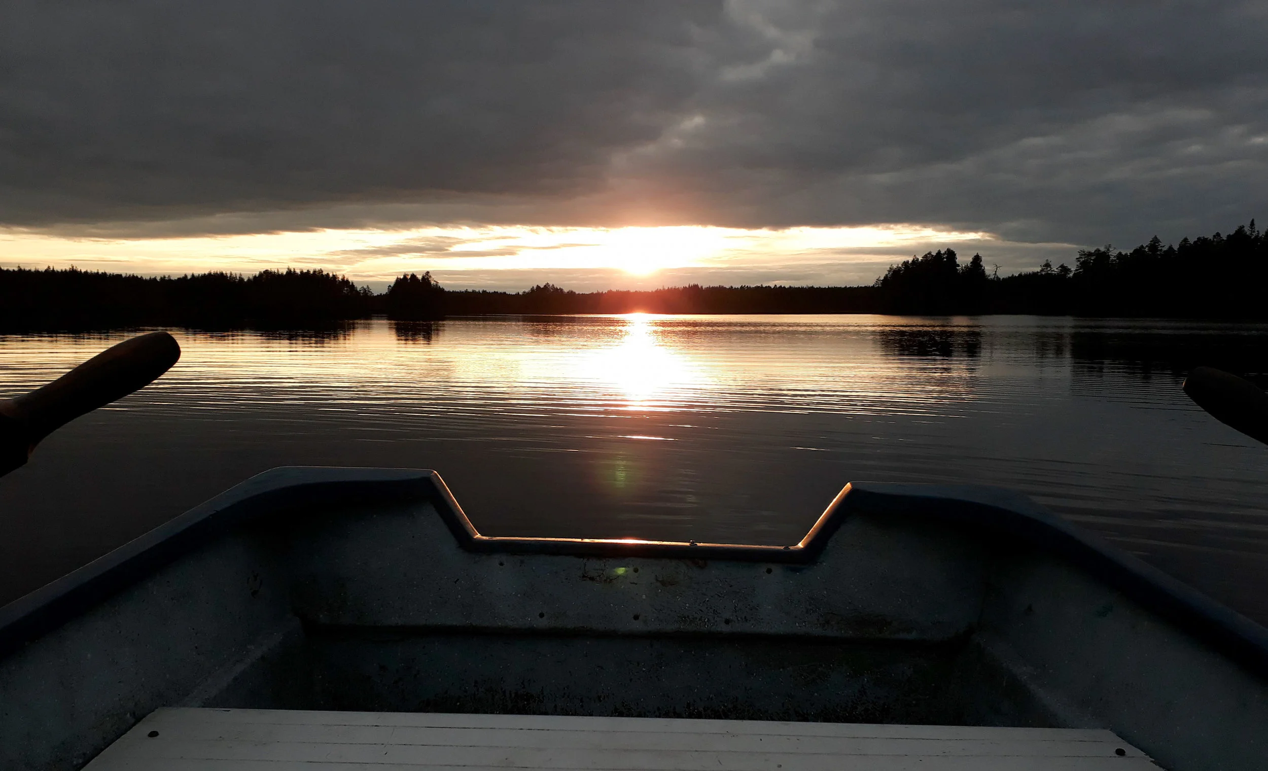 Après le boulot lundi soir, on est parti avec un ami de la team pour le coucher de soleil voir s’il y avait des oiseaux sur un grand lac à côté de la maison. Au final, la petite sortie est devenue juste magique, comme quoi c’est souvent ce que l’on a pas prévu qui rend le moment encore plus beau. L’ambiance était top, le coucher de soleil était tout enflammé et pas très loin du bord, il y avait un cygne chanteur debout sur la glace, l'air noble. Dix minutes après, l’ami vient me voir et me dit, il y a une barque juste à côté, vide et pas cadenassée (en Finlande, il y a une confiance totale, on peut tout laisser ouvert sans crainte). On a ainsi fait de la barque jusqu’à la tombée de la nuit, tellement c’était bien et reposant.